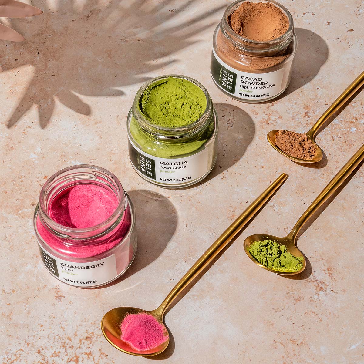 Dye-free cranberry, cacao, and matcha powders for pink-red, brown, and green food color.