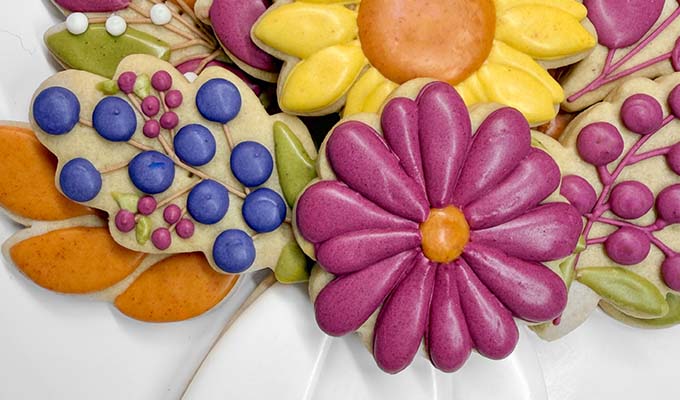 One Bowl Method - To save yourself from having to use a ton of mixing bowls for different colors, try using the one bowl method! I will plan out all the colors I will use for a set and then put them in order, starting with the lightest color and then mixing through the rainbow. For example, for this fall cookie bouquet, I started with Yellow (turmeric), then moved to orange (sweet paprika), then brown (cacao), pink (beetroot), dark pink/reddish (hibiscus), blue/purple (butterfly pea), and green (matcha). You want to scrape your bowl the best you can between colors, but you should not have to clean your bowl with water. Having a little residue from the previous color will be just fine as you mix your next color!