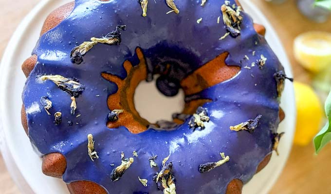 Inspired by a blooming garden, this Marbled Lemon Butterfly Pea Cake features two tones of blue in the marbling and a butterfly pea glaze. Paired with bright lemon flavor, it creates a naturally colored, lightly magical cake that’s simple yet striking.