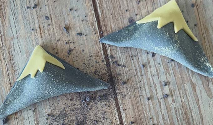 - Lay out your sheet and cut into 2.5 inch squares, using a multi-blad pasta cutter or single with ruler. Once cut load you piping bag with filling and place a shy tablespoon of filling on each square. Working quickly fold each square in half creating a triangle and seal the filling inside by pressing the dough firmly with your fingers. If need be a light spritz of water can help seal the dough if getting dry. The dough should not appear soaked or wet just lightly tacky. Cover completed triangles as you work. Once all are complete roll out your white dough and cut into squares as previously described and then in half to form triangles. With a sharp knif cut zig zags to create a mountain peak. You may need to re-roll out the dough with scrap to complete all mountain tops. Cover the snowy peaks as you work or apply them with a light spitz of water on the back to adhere them to your mountains/triangles.