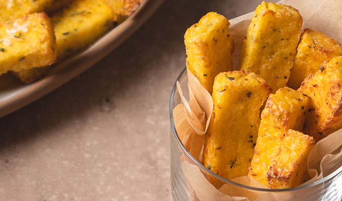 - Remove the polenta from the baking pan and cut horizontally into thirds, then vertically cut into 14 strips to make 42 fries. Drizzle with 1 tbsp olive oil.