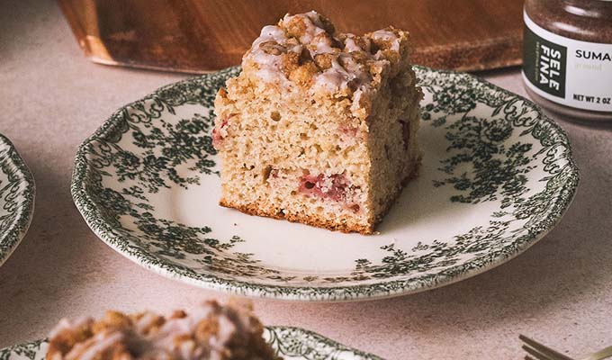Vibrant, sweet strawberries enhanced by sumac's floral and citrus notes, brings new life to a classic coffee cake. An easy cake topped with a fruity, floral icing.