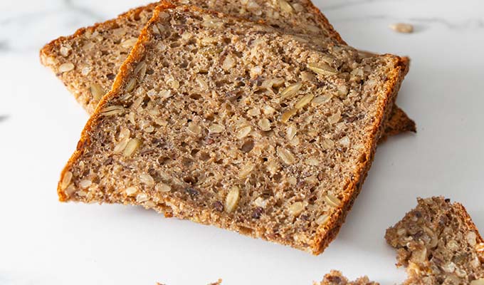 This warm, seeded rye loaf is dense, wholesome, and perfect for an open-faced sandwich. The dough is mixed as a thick paste, not a kneadable dough, and rises only modestly, producing a tight crumb studded with grains and seeds. The addition of Harvest Spice brings subtle, comforting notes that work for savory or sweet toppings.